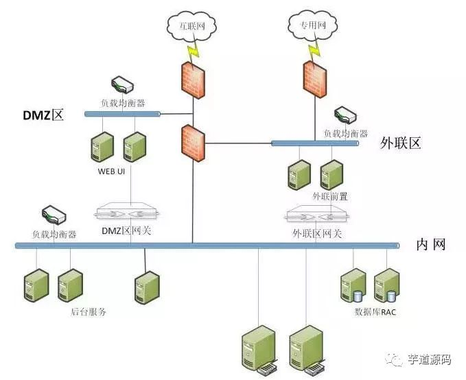 我说看着细细的蓝线条觉得不够优雅,这里我们来看看传统企业的部署架构示意图: