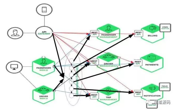 这幅图里为了方便我把网关和组合服务容器放到了一起,其实他们可以分开部署(这不重要),重要的是这个架构已经回归了ESB中心交换模式。其实传统的SOA架构最终在企业内部也是这样的,因为客户数据的安全性永远是第一位的。