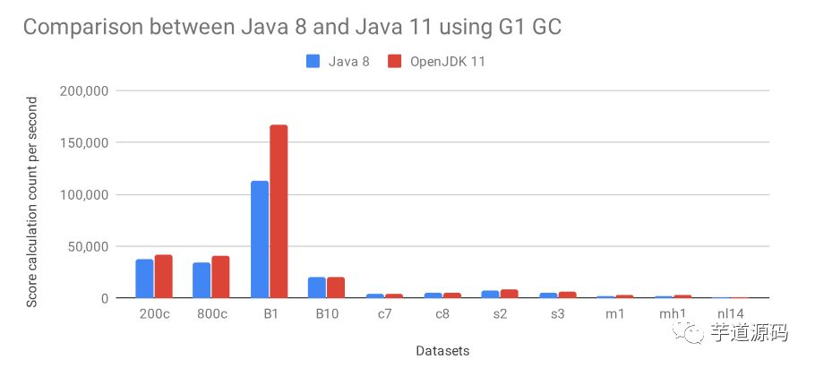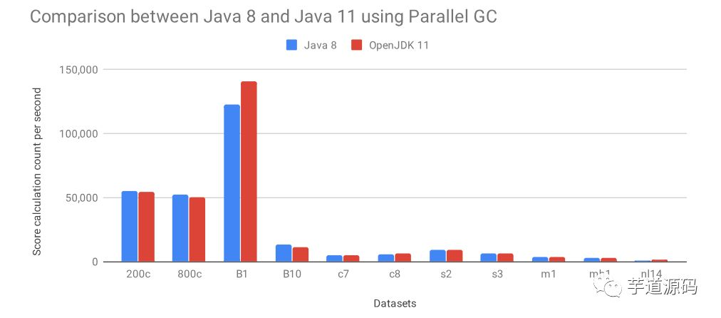 使用并行 GC,结果不如 G1,某些数据集上有所改进,但其它数据集保持不变甚至出现性能下降。平均而言,Java 11 的性能提升了 4% 以上。
