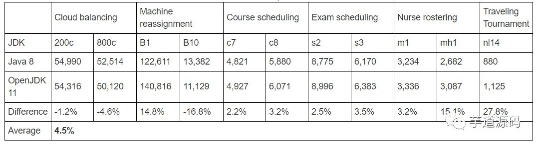 OptaPlanner 表示,从 Java 8 到 Java 11,G1 GC 的平均速度改进为 16.1%,并行 GC 为 4.5%。此外虽然并行 GC 面向吞吐量,而 G1 则侧重于低延迟 GC,但是 Java 11 中带来的 G1 显著改进,使得将两者进行直接比较是有意义的。此外,基于基准测试中的大多数数据集来看,并行 GC 还是更适合 OptaPlanner 的,因为吞吐量对于解决 OptaPlanner 的优化问题更为重要。