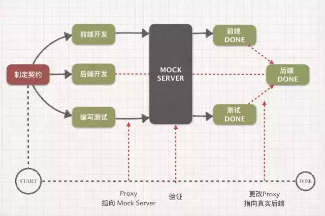 契约敲定之后要帮助我们生成 Mock Server(后面我们会介绍一个工具),前后端同学就要依照契约各自开发。Mock Server 可暂时替代后台服务,帮组前端开发,同时,测试同学也可以依照契约文档来编写测试脚本,使用 Mock Server 进行脚本验证。