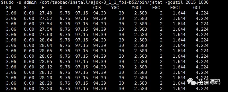 sudo -u admin /opt/taobao/install/ajdk-8_1_1_fp1-b52/bin/jstat -gcutil 2815 1000