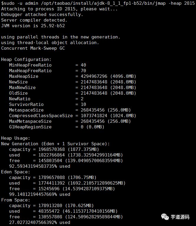 sudo -u admin /opt/taobao/install/ajdk-8_1_1_fp1-b52/bin/jmap -heap 2815