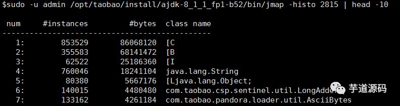 sudo -u admin /opt/taobao/install/ajdk-8_1_1_fp1-b52/bin/jmap -histo 2815 | head -10