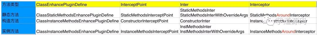 | StaticMethodsInterceptPoint | 静态方法 | #getMethodsMatcher() | #getMethodsInterceptor() | 有 |