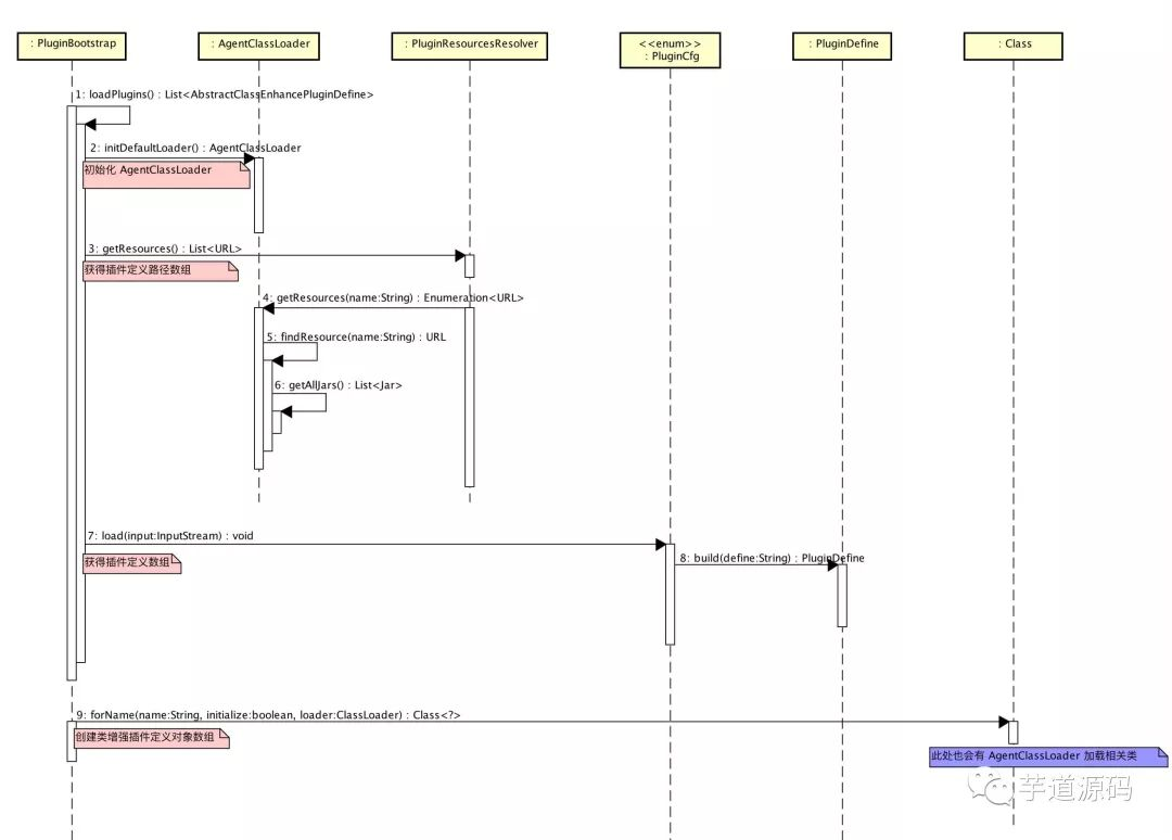 在 《SkyWalking 源码分析 —— Agent 初始化》 一文中,Agent 初始化时,调用 PluginBootstrap#loadPlugins() 方法,加载所有的插件。整体流程如下图 :