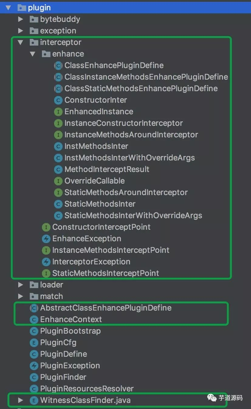 本文涉及到的类主要在 org.skywalking.apm.agent.core.plugin 包里,如下图所示 :