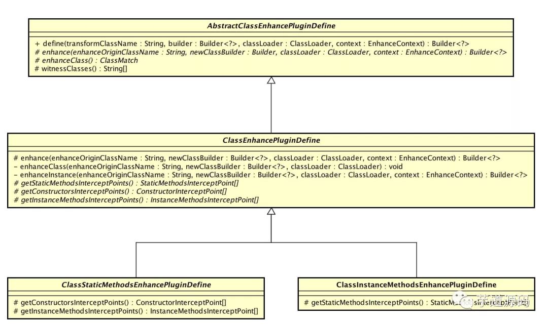 org.skywalking.apm.agent.core.plugin.interceptor.enhance.ClassInstanceMethodsEnhancePluginDefine,类增强构造方法和实例方法的插件定义抽象类,和本文 「4.1.2.2 增强构造方法和实例方法」 对应。