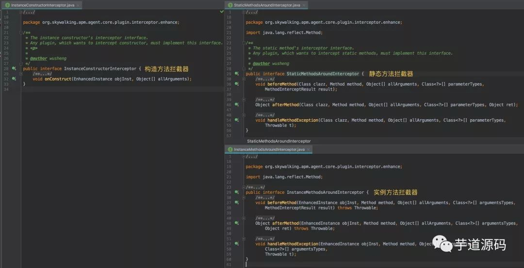 org.skywalking.apm.agent.core.plugin.interceptor.enhance.StaticMethodsInter 和 org.skywalking.apm.agent.core.plugin.interceptor.enhance.StaticMethodsInterWithOverrideArgs和实例方法 Inter基本一致,胖友可以自己捋一捋,笔者就不瞎比比了。