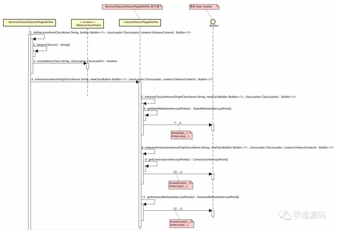 第 86 至 100 行 :循环匹配到 AbstractClassEnhancePluginDefine 数组,调用 `AbstractClassEnhancePluginDefine#define(…)` 方法,设置 `net.bytebuddy.dynamic.DynamicType.Builder` 对象。通过该对象,定义如何拦截需要修改的 Java 类。在 `AbstractClassEnhancePluginDefine#define(…)` 方法的内部,会调用 `net.bytebuddy.dynamic.DynamicType.ImplementationDefinition#intercept(Implementation)`方法,本文 「4. 插件的拦截」 也会详细解析。