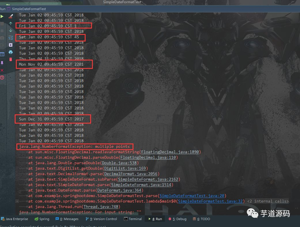 你看这不崩了?部分线程获取的时间不对,部分线程直接报java.lang.NumberFormatException: multiple points错,线程直接挂死了。