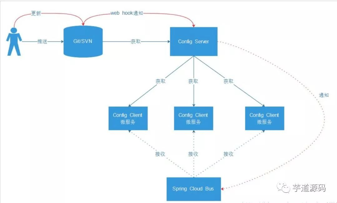 Spring Cloud Config原生不支持配置的实时推送,需要依赖Git的WebHook、Spring Cloud Bus和客户端/bus/refresh端点: