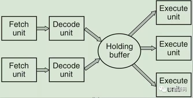 8、更优化的CPU架构是superscalar架构(超标量架构)。这种架构将取指、解码、执行单元分开,有大量的执行单元,然后每个取指+解码的部分都以并行的方式运行。比如有2个取指+解码的并行工作线路,每个工作线路都将解码后的指令放入一个缓存缓冲区等待执行单元去取出执行。