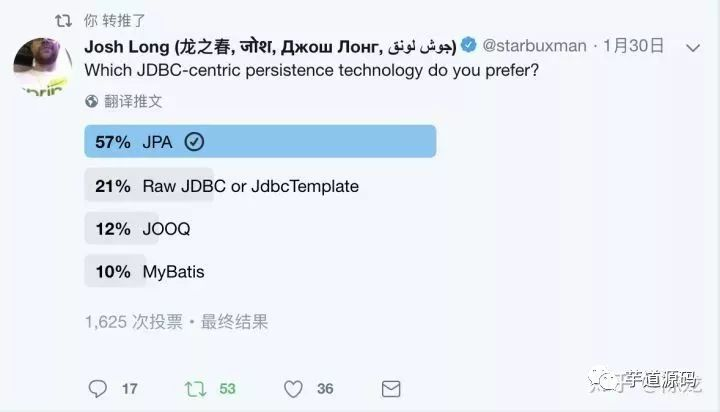 Spring 团队的Josh Long自己在Twitter上做了一个调查。1625次投票,样本量不算大,但也能说明问题。和我答案最后的那些调查图表基本一致。
