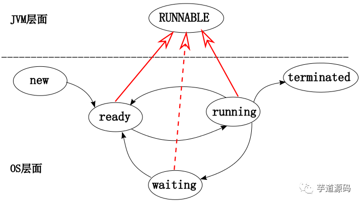 现今主流的 JVM 实现都把 Java 线程一一映射到操作系统底层的线程上,把调度委托给了操作系统,我们在虚拟机层面看到的状态实质是对底层状态的映射及包装。JVM 本身没有做什么实质的调度,把底层的 ready 及 running 状态映射上来也没多大意义,因此,统一成为runnable 状态是不错的选择。