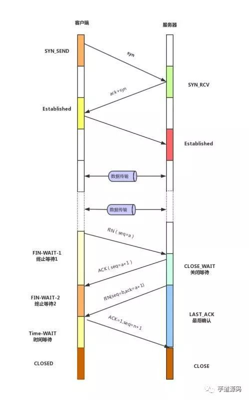 第四次挥手(ACK=1,ACKnum=b+1),客户端接收到来自服务器端的关闭请求,发送一个确认包,并进入 TIME_WAIT状态,等待了某个固定时间(两个最大段生命周期,2MSL,2 Maximum Segment Lifetime)之后,没有收到服务器端的 ACK ,认为服务器端已经正常关闭连接,于是自己也关闭连接,进入 CLOSED 状态。服务器端接收到这个确认包之后,关闭连接,进入 CLOSED 状态。