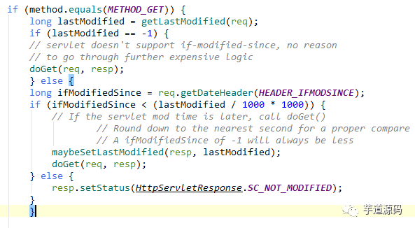 先别沮丧,忘了我们要解释什么问题吗——为什么不要重写service方法。也许你已经猜到了,如果你看看service方法的实现,现在你已经明白了,service方法自己实现了缓存协商的机制,如果我们重写它,反而将这中良好的机制给去掉了。