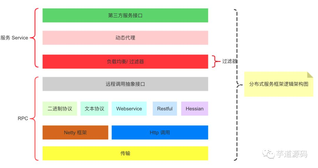 尽管不同的分布式服务框架实现细节存在差异,但是核心功能差异不大,下面的架构图描绘了一个分布式服务框架的整体逻辑架构。