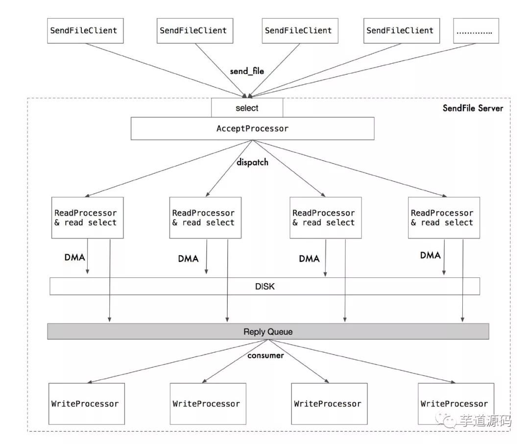 readProcessor 在读到数据后,会将其写入到磁盘中(DMA 的方式,性能炸裂)。