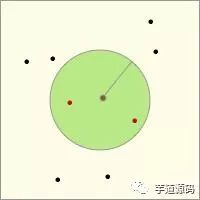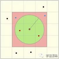令左图的中心为搜索中心,绿色圆形区域为目标区域,所有点为待搜索的位置对象,红色点则为满足条件的位置对象。