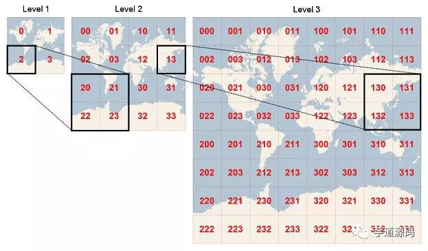 这其实是一个问题,本质上是对所有的元素对象进行了一次初步筛选。在多层geohash网格中,每个低等级的geohash网格都是由4个高一级的网格拼接而成(如图)。