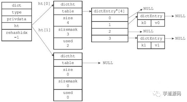 dictEntry:Redis给每个key-value键值对分配一个dictEntry,里面有着key和val的指针,next指向下一个dictEntry形成链表,这个指针可以将多个哈希值相同的键值对链接在一起,由此来解决哈希冲突问题(链地址法)。