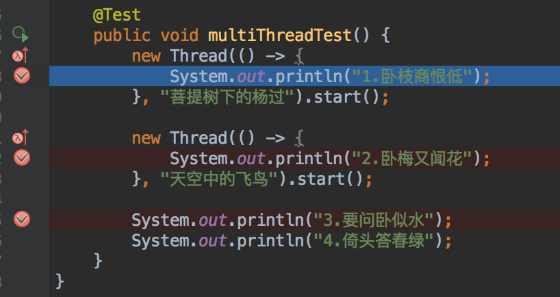 注意上图中的红框位置,断点停下来时,这个下拉框可以看到各个线程(注:给线程起个容易识别的名字是个好习惯!),我们可以选择线程“天空中的飞鸟”