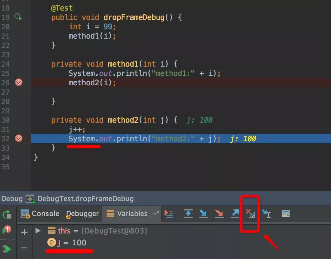 参考上图,method1方法调用method2,当前断点的位置j=100,点击上图红色箭头位置的Drop Frame图标后,时间穿越了
