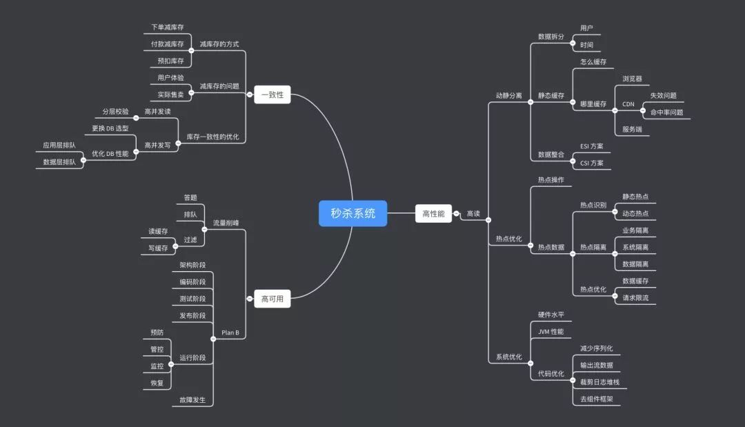 首先从高维度出发,整体思考问题。秒杀无外乎解决两个核心问题,一是并发读,一是并发写,对应到架构设计,就是高可用、一致性和高性能的要求。