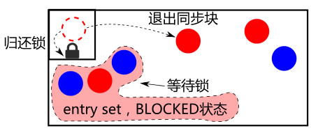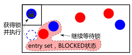在一个线程还在厕所期间,其它同时想上厕所的线程被阻塞,处在该厕所对象的 entry set 中,处于 BLOCKED 状态。