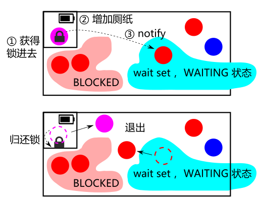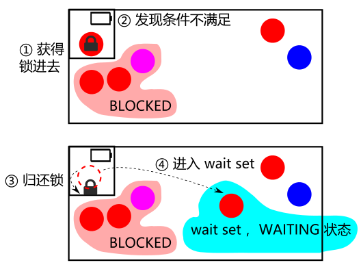 当条件不满足时,应该调用 wait()方法,这时线程释放锁,并进入所谓的 wait set 中,具体的讲,是进入这个厕所对象的 wait set 中: