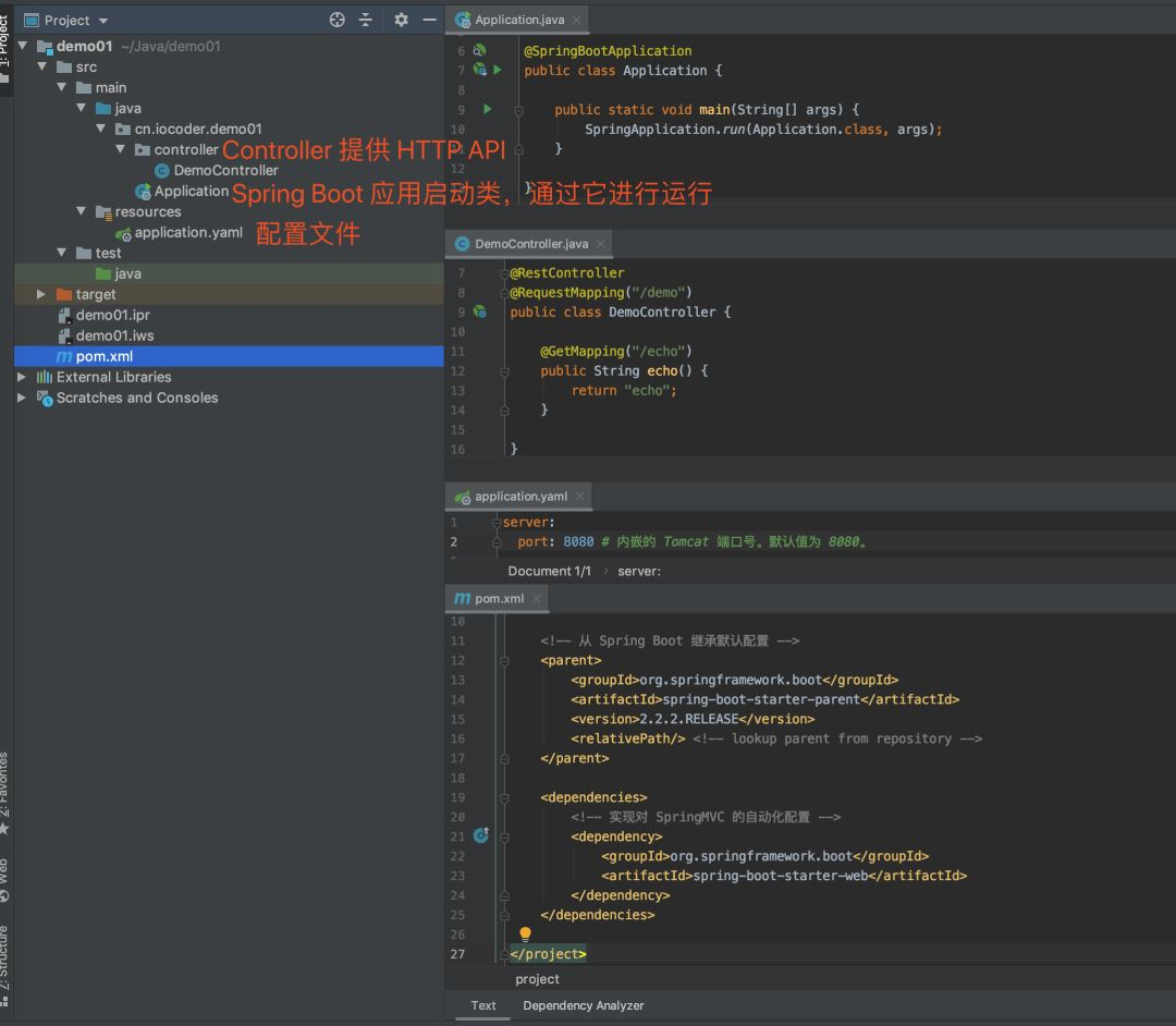 创建 DemoController 类,提供一个简单的 HTTP API。代码如下: