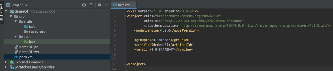 ④ 点击「Finish」按钮,完成 Maven 项目的创建。此时项目如下图所示: