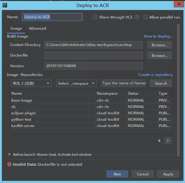Cloud Toolkit 提供了图形化的 Docker Image 打包工具,能够帮助开发者即使在不熟悉 Docker 的情况下,也可以快速打包镜像,并推送到阿里云镜像仓库 ACR 。