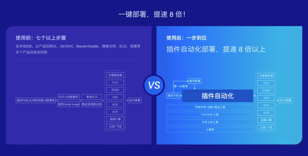 Cloud Toolkit 是阿里云发布的免费本地 IDE 插件,帮助开发者更高效地开发、测试、诊断并部署应用。通过插件,可以将本地应用一键部署到任意服务器,甚至云端(ECS、EDAS、ACK、ACR 和 小程序云等);并且还内置了 Arthas 诊断、Dubbo工具、Terminal 终端、文件上传、函数计算 和 MySQL 执行器等工具。不仅仅有 IntelliJ IDEA 主流版本,还有 Eclipse、Pycharm、Maven 等其他版本。今年 2 月,Cloud Toolkit 刚刚发布了 Visual Studio Code 版本,全面覆盖前端开发者,帮助前端实现一键打包部署,让开发提速 8 倍。