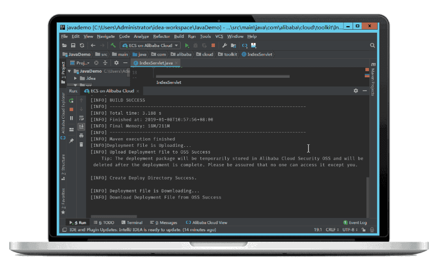 如上图所示,开发者本地编写的应用程序,在图形化界面上进行配置,即可持续便利的部署到任意服务器,或者阿里云的 ECS 服务器上;在 IDEA 或 Eclipse 中完成编码后,无须在 Maven 、Git 以及其他运维脚本和工具的之间切换,借助 Cloud Toolkit,在 IDE 的图形界面上选择一个或若干个实例,即可将应用程序部署至指定目录。
