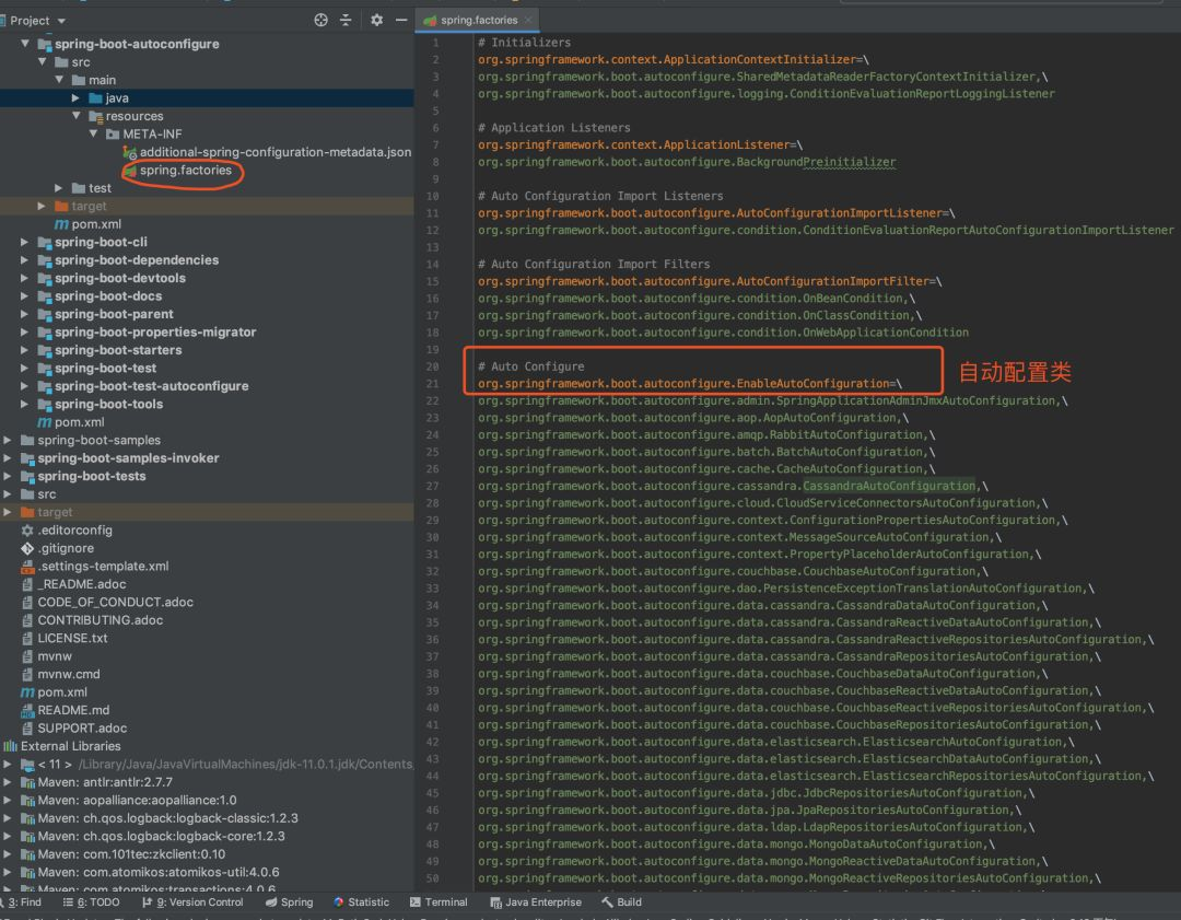 我们以 spring-boot-autoconfigure 项目的 Spring Boot spring.factories 文件来举个例子,如下图所示: