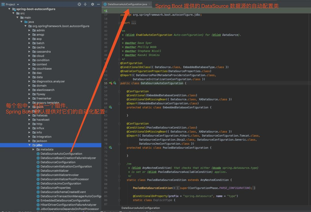 在 Spring Boot 的 spring-boot-autoconfigure 项目,提供了大量框架的自动配置,如下图所示: