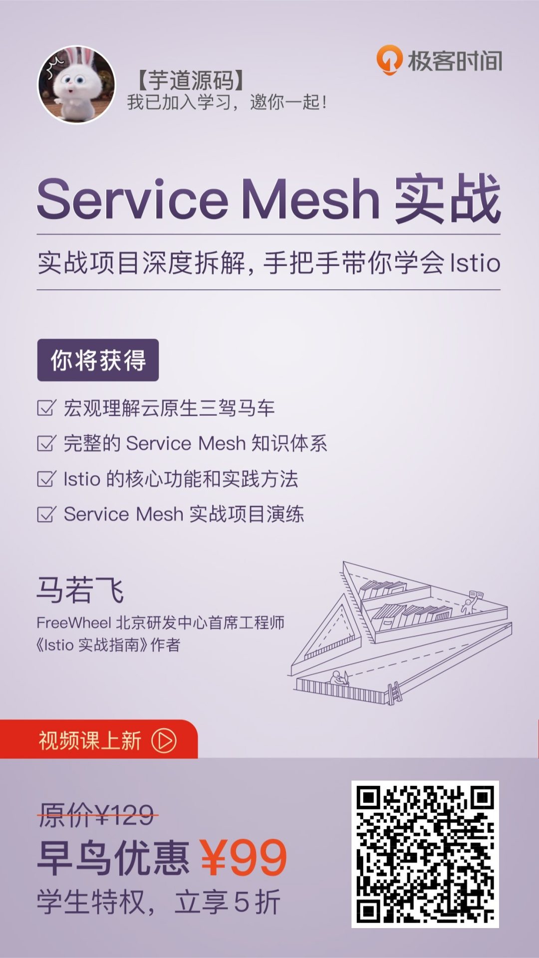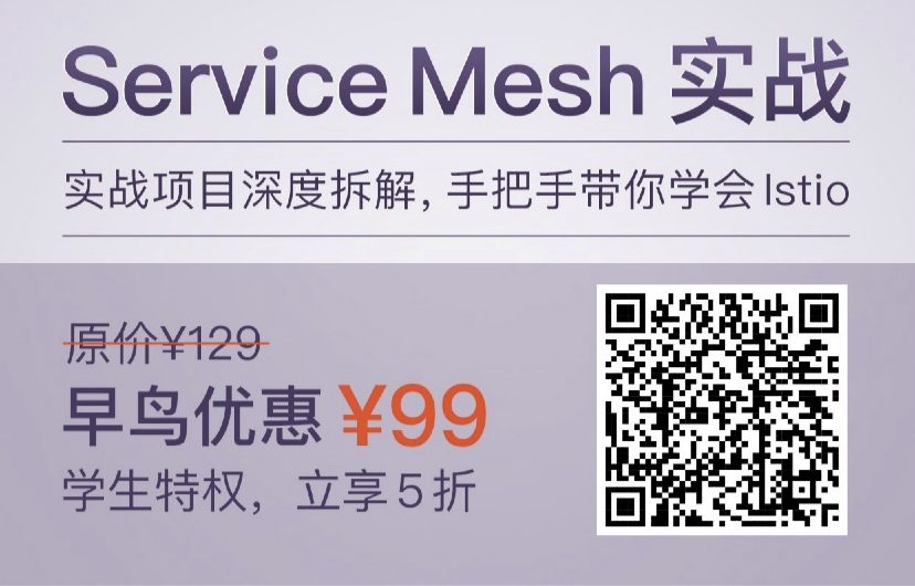 刚好,极客时间新推出了视频课《Service Mesh 实战》,课程从回顾服务网格的发展历程讲起,通过实战演练,能够帮你建立完整的 Service Mesh 知识体系,熟练掌握 Istio 流量控制、安全、服务可观测性等核心功能。同时,课程还借由几个最佳实践,将 Service Mesh 应用到项目中,带你成为真正的 Service Mesh 技术践行者。