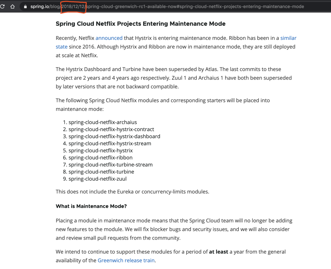 因此,Spring Cloud Netflix 进入维护模式,可见《Spring Cloud Greenwich.RC1 available now》新闻。如下图所示: