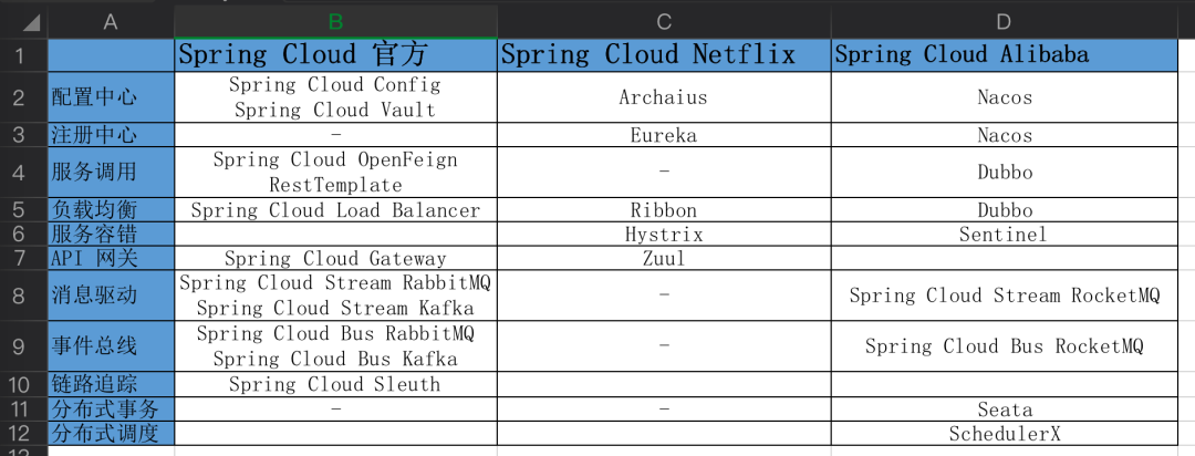 下面,我们把 Spring Cloud 官方、Netflix、Alibaba 三者整理成如下表格: