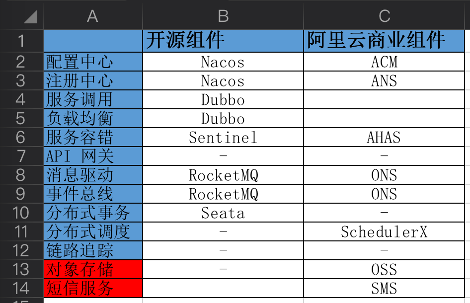 我们可以将 Spring Cloud Alibaba 套件中的阿里开源组件和阿里云商业组件整理成如下对照表: