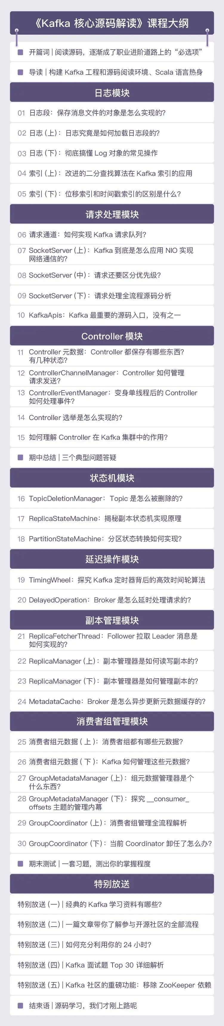 除此之外,他还会和你分享一些延伸内容,比如:成为 Apache Kafka 社区代码贡献者的具体方法、实用的 Kafka 学习资料、经典面试题讲解等等。