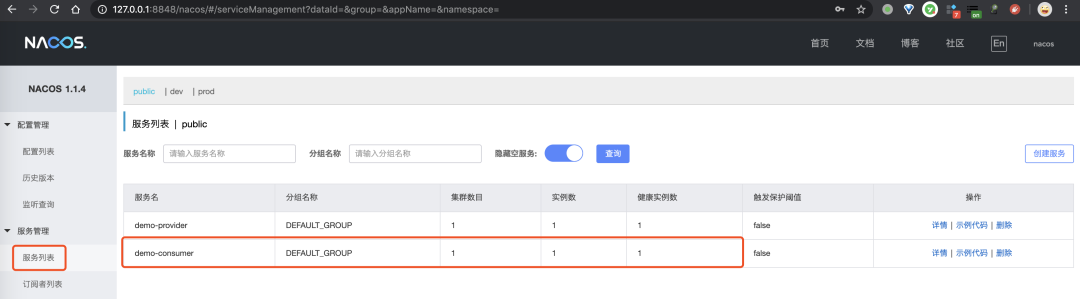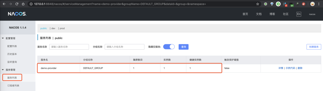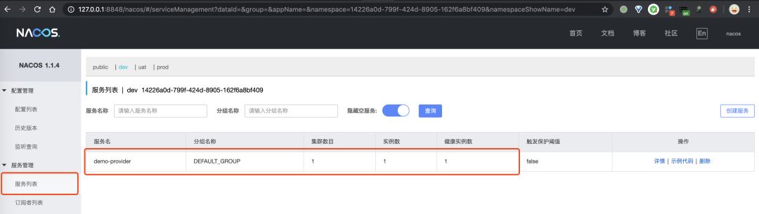 ② 打开 Nacos 控制台,可以在服务列表看到服务 demo-provider 注册在命名空间 dev 下。如下图:
