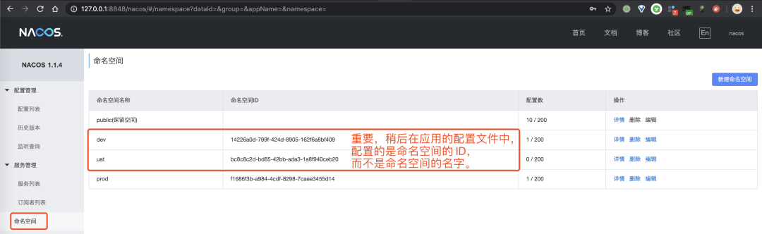 实际上,Nacos 开发者已经告诉我们如何实现了,通过 Nacos Namespace 命名空间。文档说明如下:
