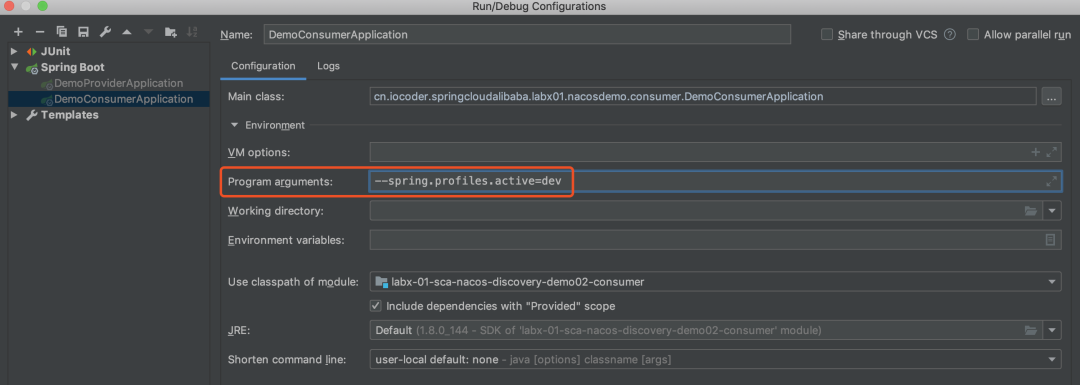 ① 先配置 --spring.profiles.active 为 dev,设置 DemoConsumerApplication 读取 application-dev.yaml 配置文件。如下图所示: