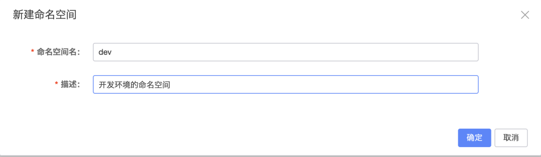 ② 点击列表右上角的「新建命名空间」按钮,弹出「新建命名空间」窗口,创建一个 dev 命名空间。输入如下内容,并点击「确定」按钮,完成创建。如下图所示: