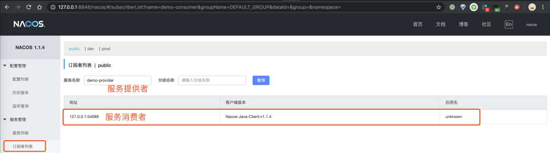 demo-provider是在 NacosdevNamespace 下注册,所以调用它成功。后使用测试环境配置,因为服务