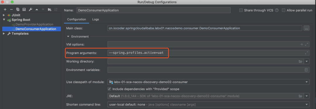 ② 再配置 --spring.profiles.active 为 uat,设置 DemoConsumerApplication 读取 application-uat.yaml 配置文件。如下图所示:
