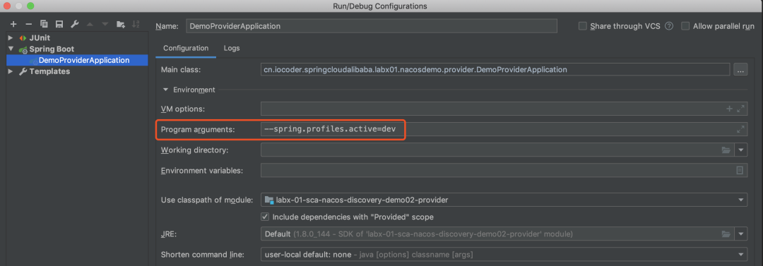 ① 先配置 --spring.profiles.active 为 dev,设置 DemoProviderApplication 读取 application-dev.yaml 配置文件。如下图所示: